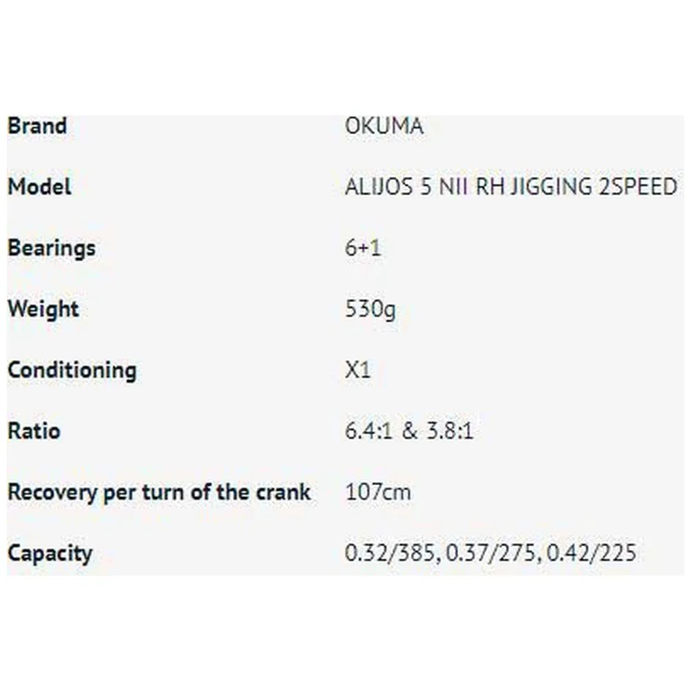 The Alijos 2-Speed Lever Drag is a lightweight, compact bodied, big fish stopping machine. Built with 6061-T6 machined aluminum for the ultimate in strength. The 1-piece frame continues around to the non-handle side, side plate which has a cast control system for precision spool control. The spool bearings are bathed in TSI oil giving it the ultimate in castability and frees spool. The Alijos reels feature a longer 90mm handle harm and oversized T-bar handle knob for great torque and comfort. The clicker mechanism has been reworked to give a louder clicking sound for trolling or dead stick applications. The new 2-speed shifting mechanism has been completely reworked by Okuma giving it the ultimate in shifting. The DFD: Dual Force Drag puts out tremendous drag pressure with its 100% larger drag plates.
